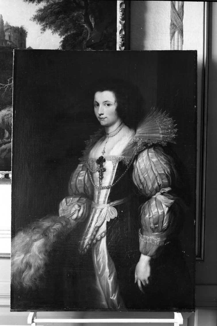 Fotografi av oljemålning, porträtt av okänd kvinna i 1600-talsdräkt. Okänd upphovsman.