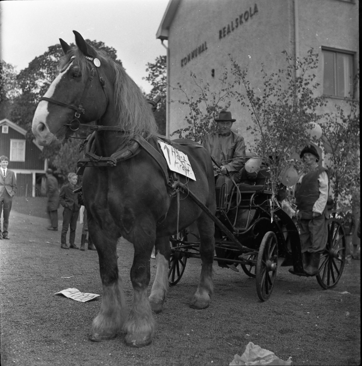 Realexamen 1961. En häst med kärra står uppställda utanför den kommunala realskolan. Kärran är klädd med björkris. Från hästens sele hänger ett plakat med texten Hästkraft på.