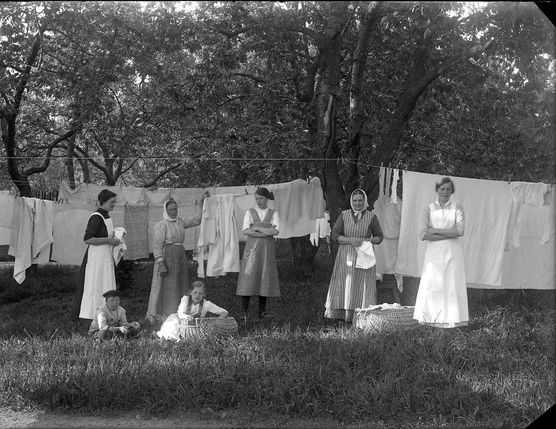 Kvinnor hänger tvätt på tvättlinor i en trädgård. Två barn sitter på gräset vid tvättkorgar.