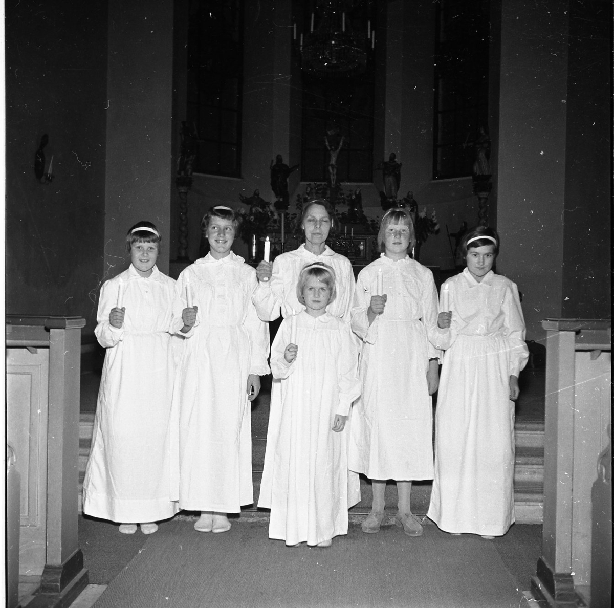 En luciakör står framför ett altare. De bär vita skrudar och håller i varsitt levande ljus.