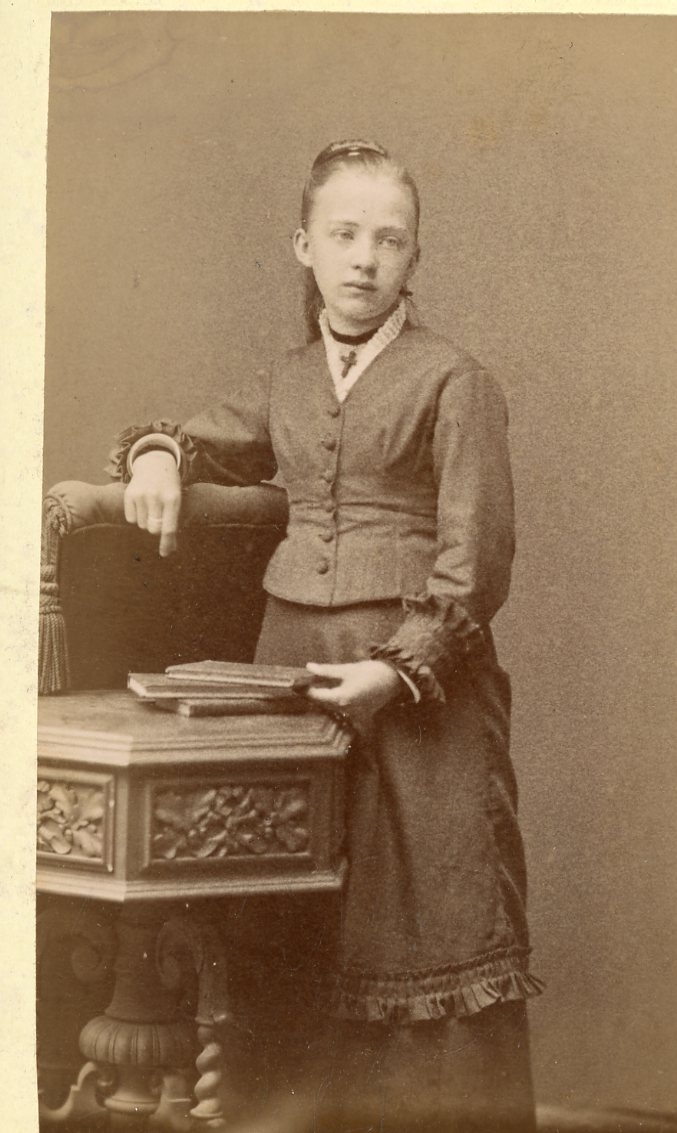 Kabinettsfotografi av en flicka som står vid ett sexkantigt bord med böcker. Hon vilar höger arm på en stolsrygg. Hon ser lite sorgsen ut.