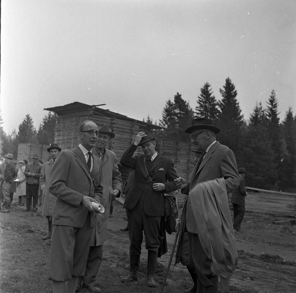 Skogsdag Örserums brunn 1961. Framför en brädgård står några män. De tittar sig omkring. Vissa av dem bär hatt. En man håller i en käpp. Skogen skymtar i bakgrunden.