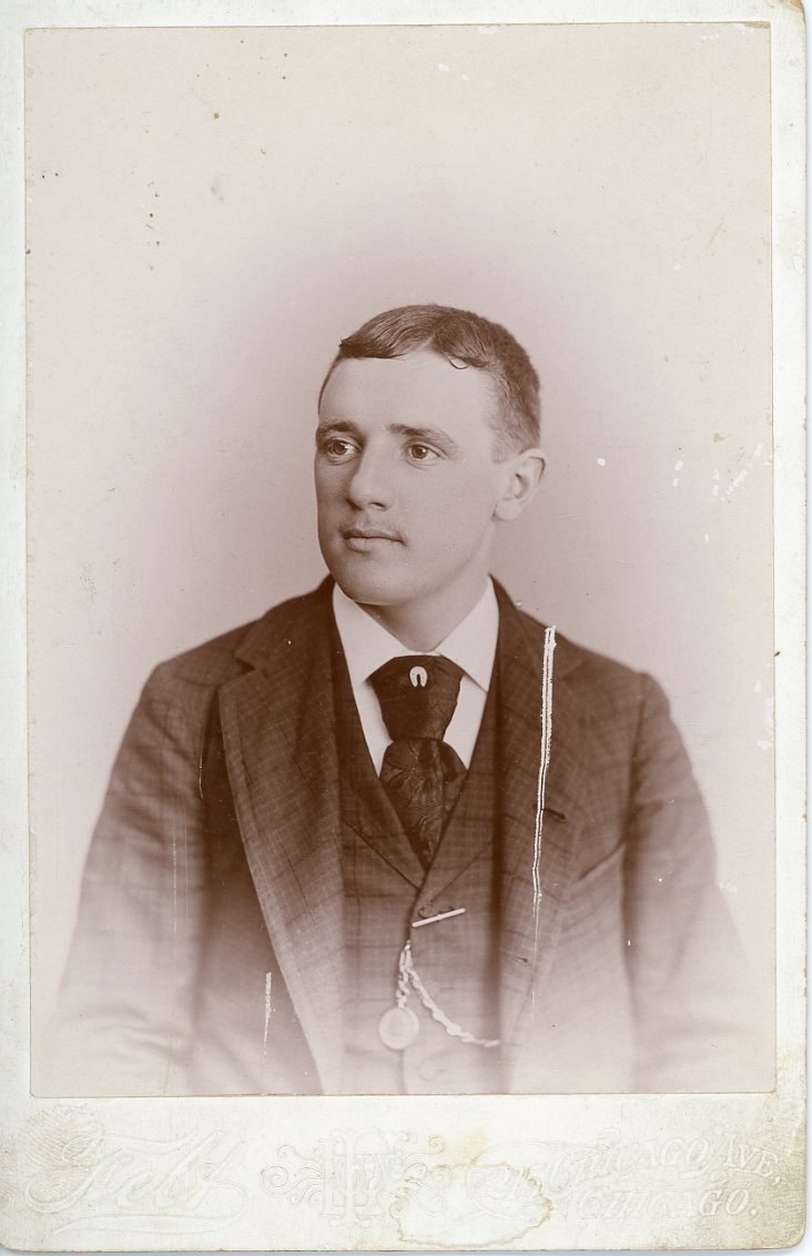 Kabinettsfotografi av en okänd ung man i rutig kostym med väst och slips. En slipsnål i form av en hästsko, fickur i klockkedja.