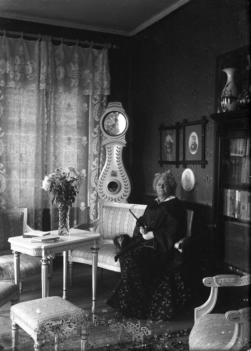 En äldre kvinna sitter vid ett möblemang av gustavianskt snitt: bord, soffa, stolar och taburetter. I hörnet ett ljust golvur, till höger ett boksskåp med glasdörrar. En byrå till vänster med ljusstake och stor spegel på väggen ovanför.