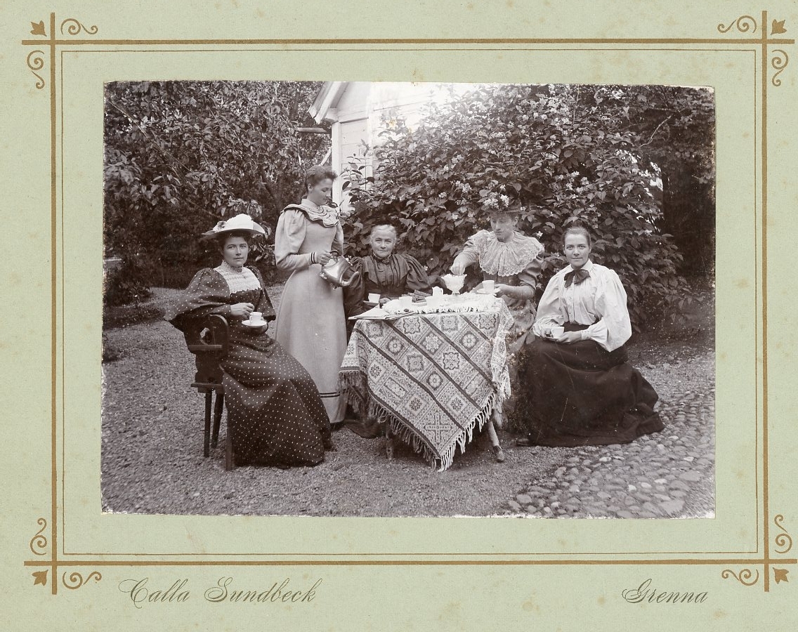 Fem kvinnor runt en trädgårdsmöbel, en äldre kvinna i mitten. En kvinna står upp och serverar kaffe ur en kaffekanna. De andra har en kaffekopp i händerna.