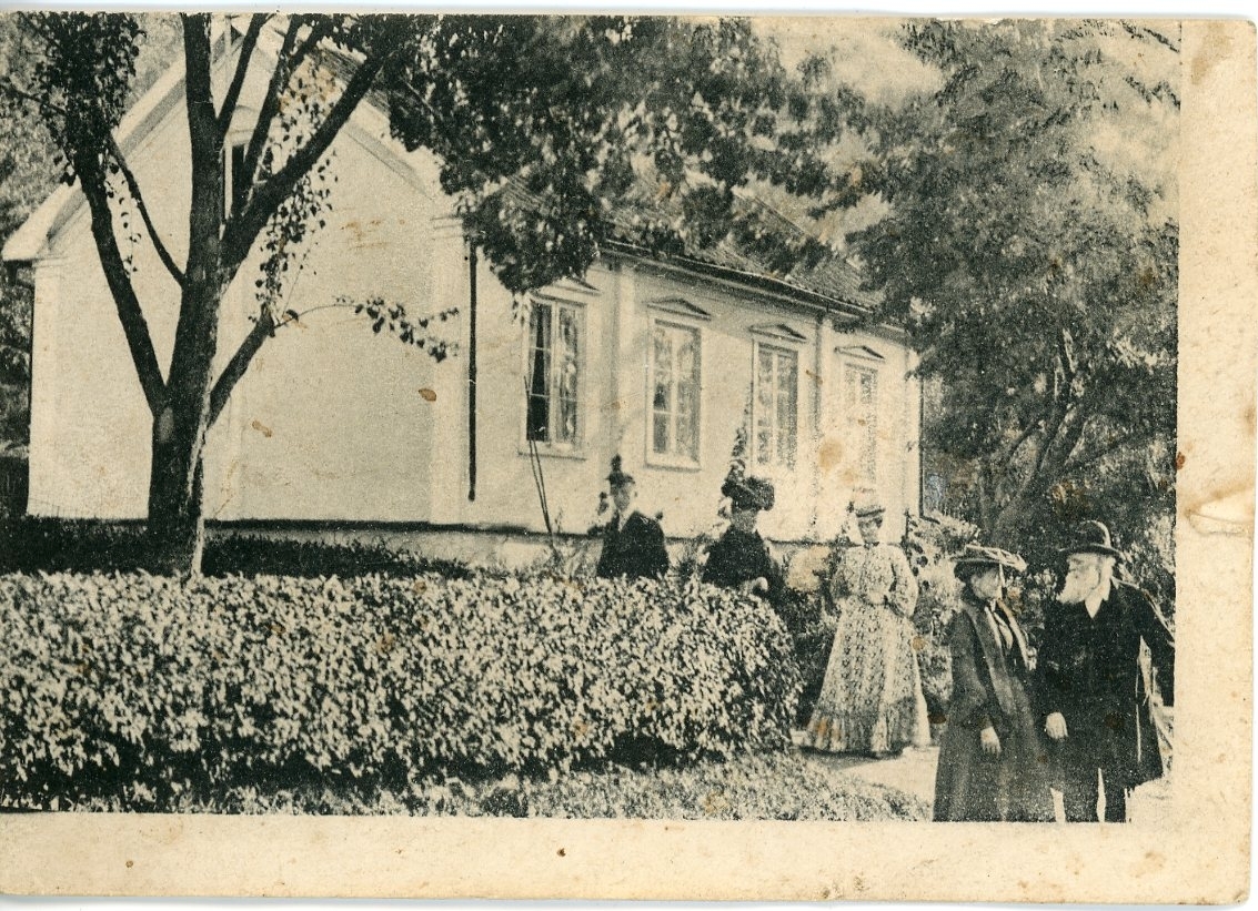Ett sällskap står vid uppfarten till ett putsat envåningshus.