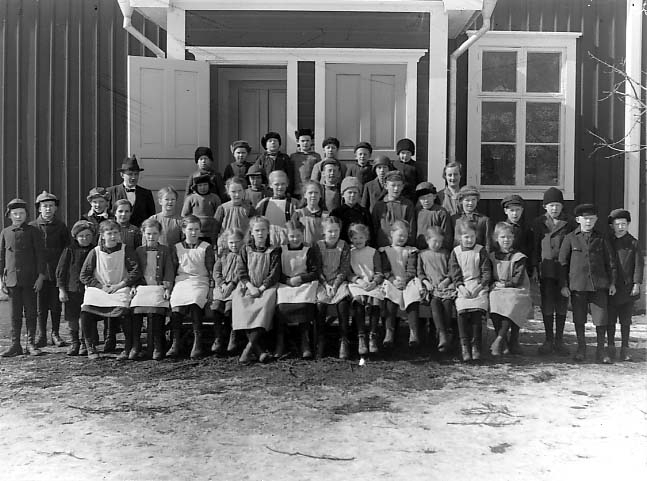 En skolklass med flickor och pojkar står uppställda framför sin skola.