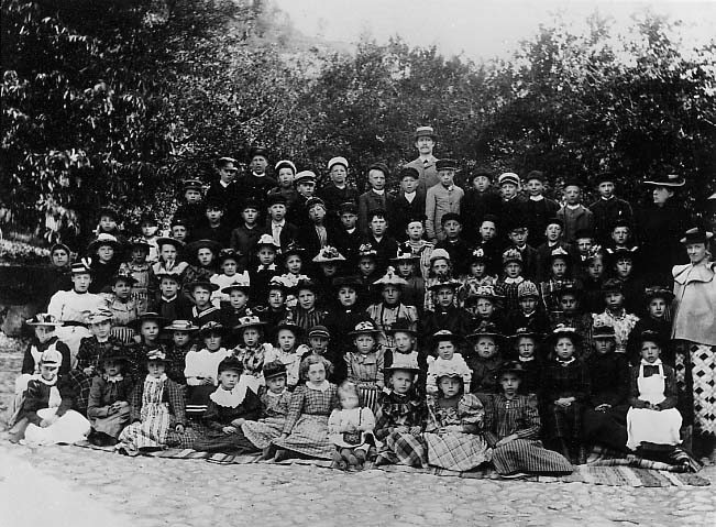 En mycket stor skolgrupp med flickor och pojkar uppställda i fyra led vid en husknut. Folkskollärare Kellner står högst upp och längst bak. Till höger står två kvinnor varav en är "mamsell Jansson".