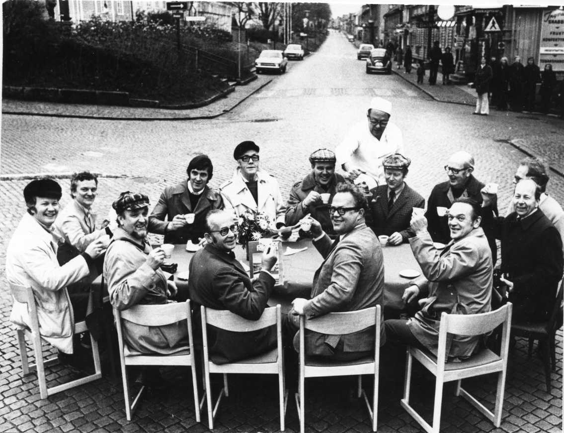 Tretton män sitter runt ett bord och dricker kaffe, vända mot fotografen och skrattar. En konditor går runt och fyller på kaffe. Bordet är placerat mittpå Brahegatan i Gränna, nedanför torget
