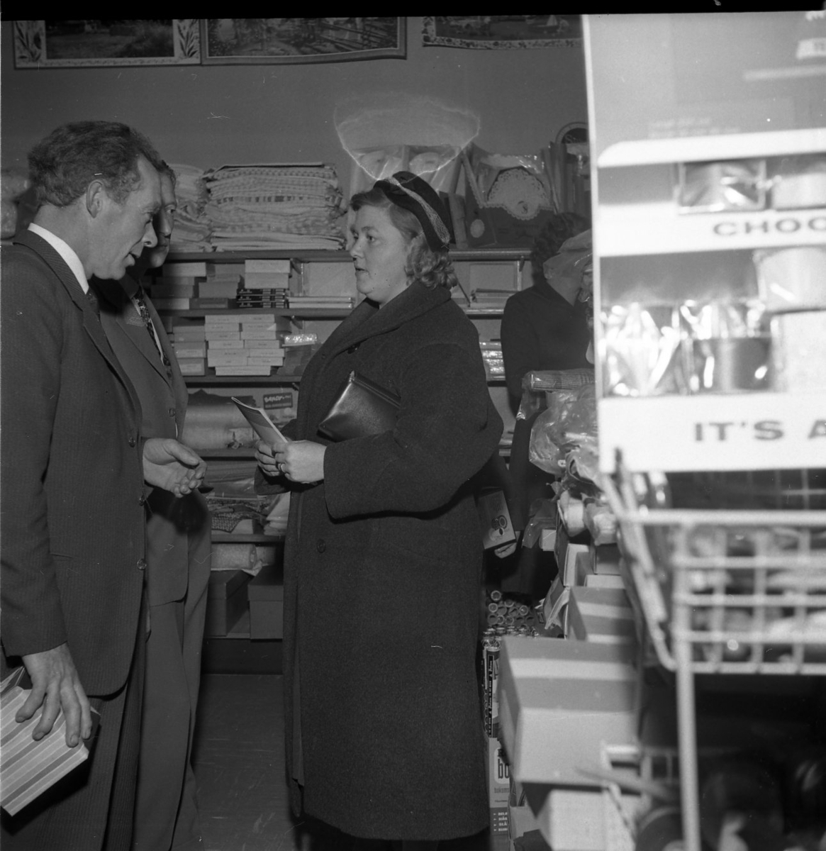 En kvinna med kappa och hatt står och pratar med en herre i en sybehörsbutik.