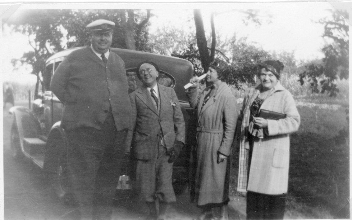 Två män och två kvinnor står bakom en bil. Den ena mannen är förhållandevis mycket stor.