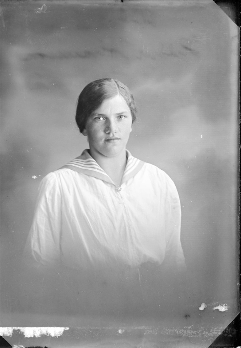 Titel: Porträtt av en ung kvinna i ljus klänning med sjömanskrage.