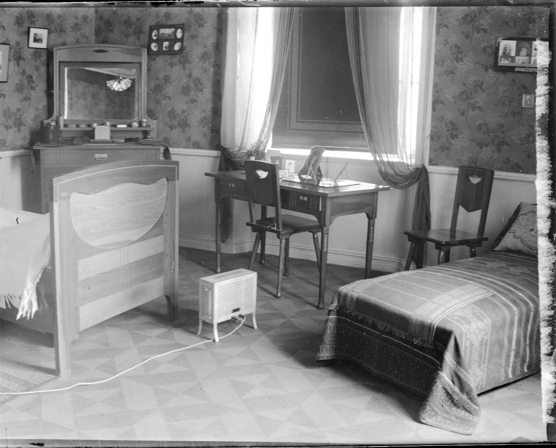 Interiör från ett hem. Ett litet elektriskt element? står på golvet mellan två sängar.