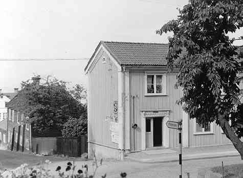 En fastighet i hörnet av Brahegatan och Hamnvägen i Gränna. På gaveln en skylt med texten: "Nedfart till Turisthotellet". I backen ned mot hamnen ligger en byggnad för garveri. Ett plank mellan detsamma och gatuhuset.
