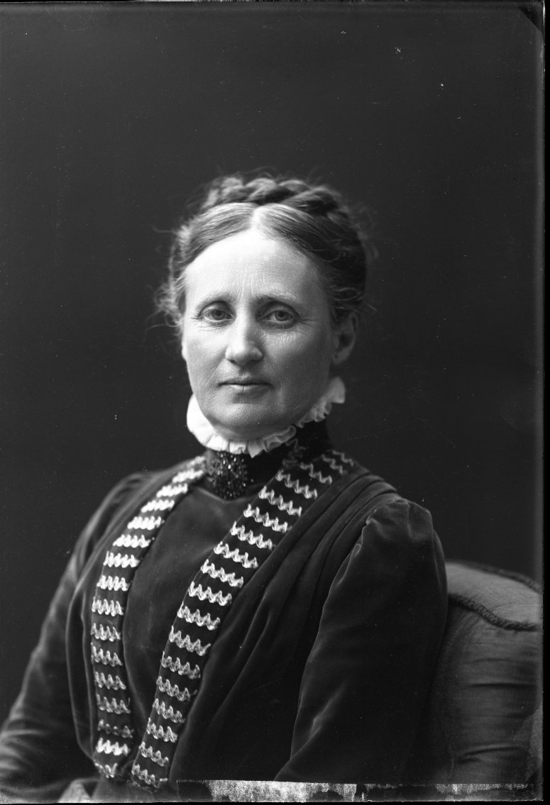 Porträtt av en kvinna med flätat, uppsatt hår.
