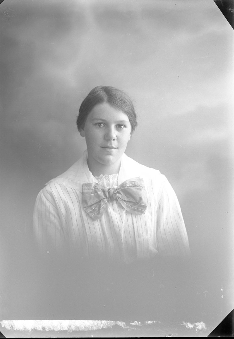 Porträtt av en flicka i tonåren. Hon har en stor rosett vid halsen.