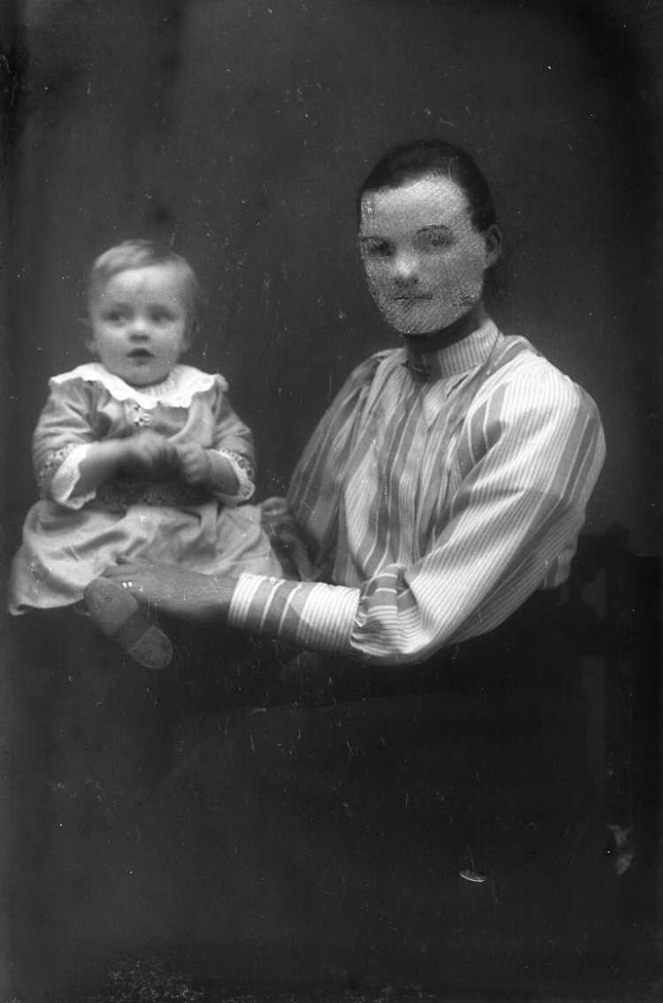 Porträtt av en kvinna med ett spädbarn. Kvinnans ansikte är skadat/retuscherat.