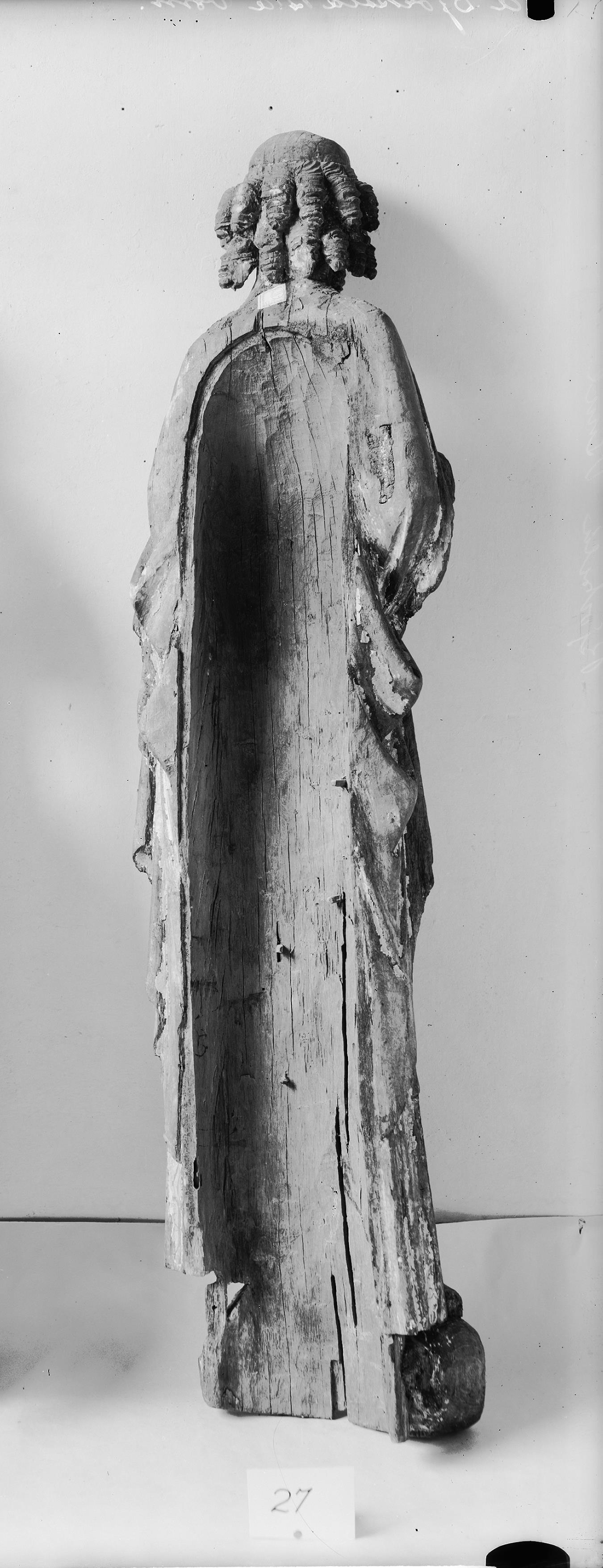 En skulptur av S:t Olof. Bild av ek: står på skalle. Bevarade rester av polykromin visar att manteln varit i guld med brokadmönster. Huvudet skulpterat runtom, ryggen urhålkad. Svenskt-franskt arbete från 1300-talets början (snabbinv). Saknar armar.