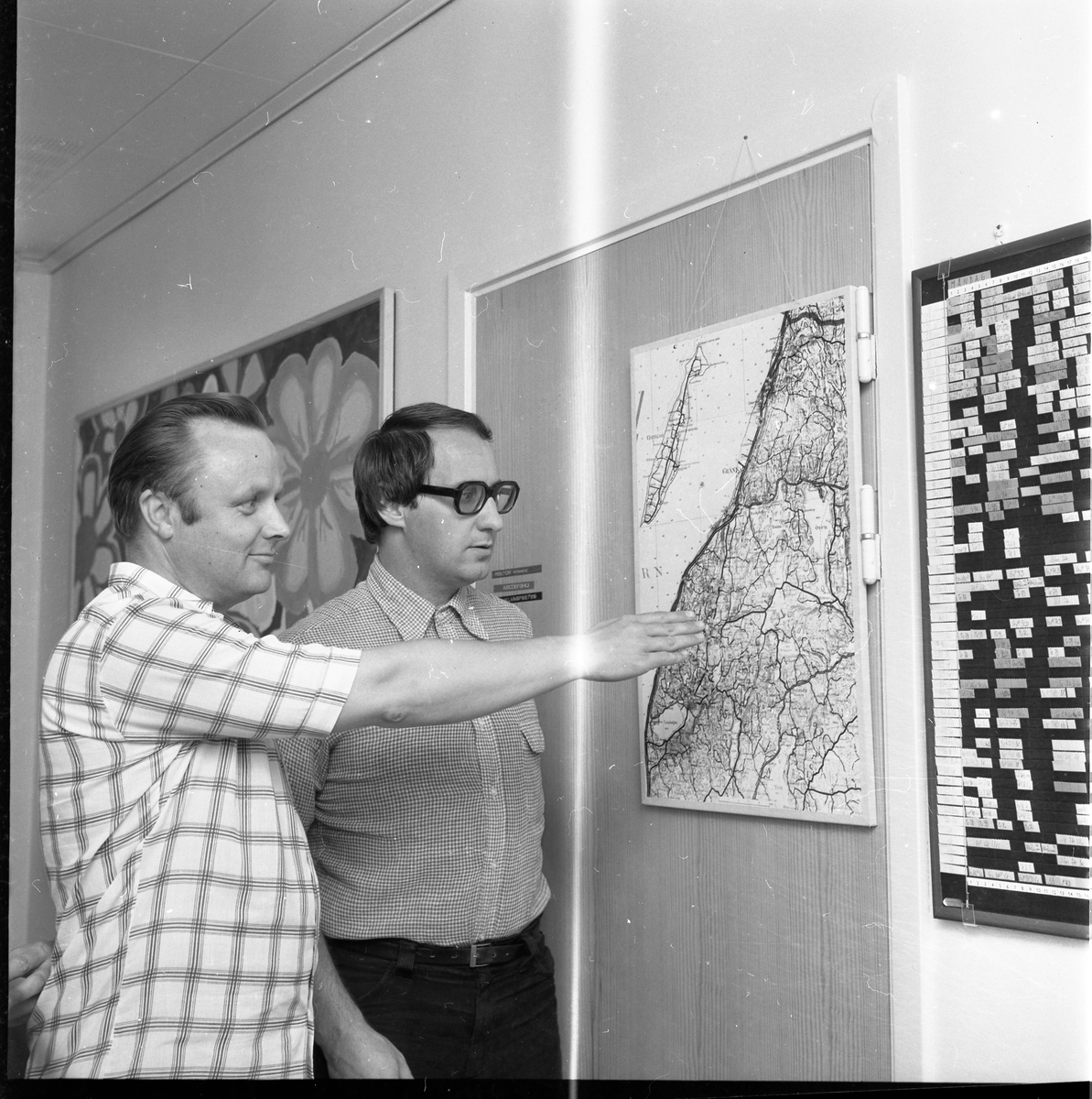 Två män står framför en karta som utvisar Vista härad, det är skolledning som diskuterar skolskjutsorganisation.