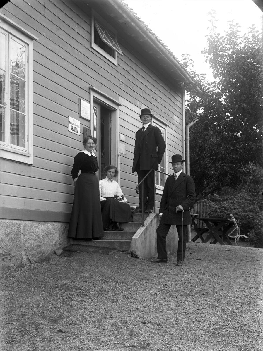 Kommissarie Carlson, sannolikt på gården till kv Mästermannen 12 i Gränna. Förmodligen hustrun Gerd till vänster, i övrigt okända personer.