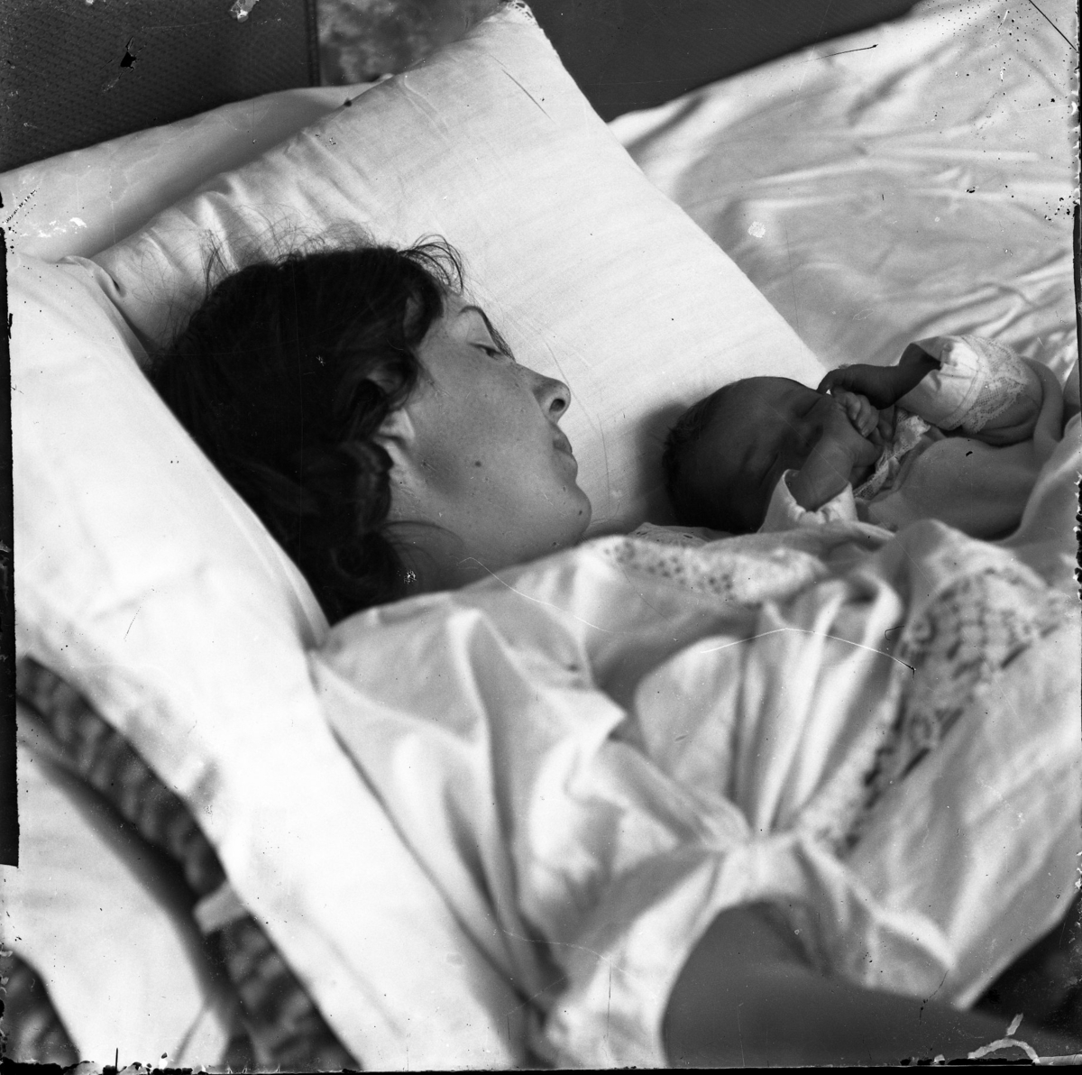 Friherrinnan Helga von Otter med, troligen, dottern Birgit intill sig i sängen. Glasplåt.