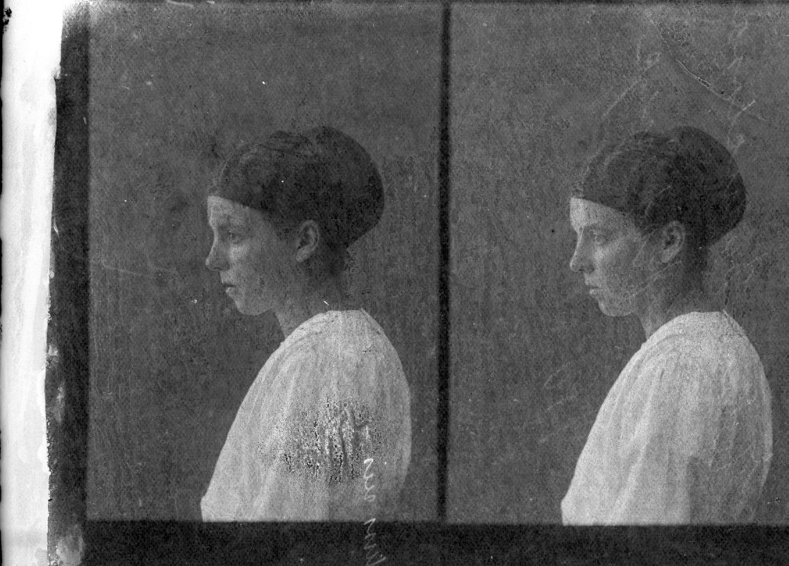 Bröstbild, profil, av en ung kvinna. Två bilder på samma glasplåt.