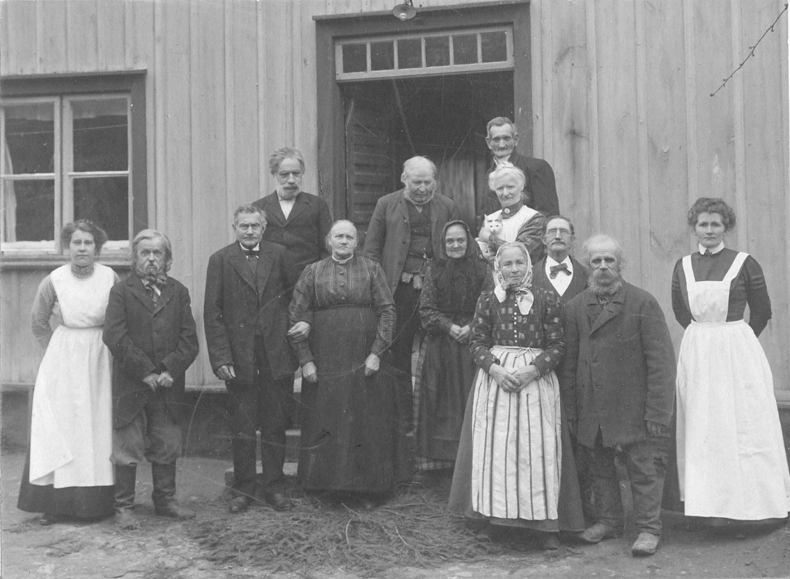 En grupp åldringar med tre kvinnlig anställda varav en håller en katt i famnen. De står på trappan till stadens ålderdomshem.