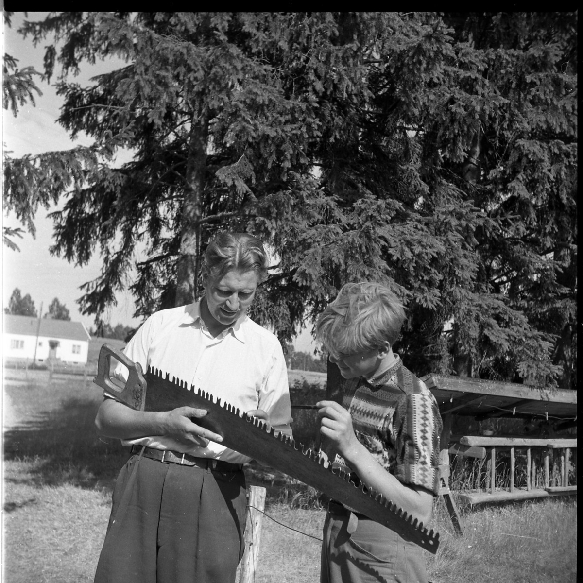 Skogvaktare Per Svensson står med en såg i famnen. Sågen är lång och har väldigt grova tänder. En yngre man står och tittar på sågen.