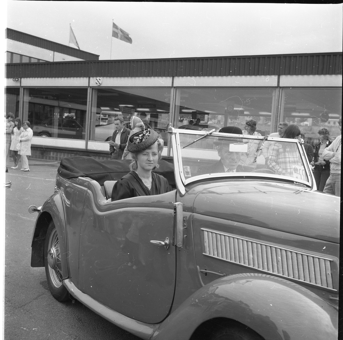 En kvinna och en man i nercabbad veteranbil, troligen vid Ekhagen Jönköping.