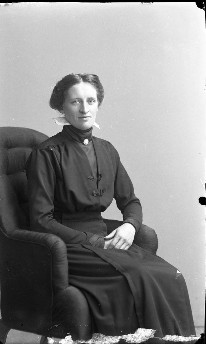 En kvinna i mörk klänning sitter i en fåtölj med händerna i knät.