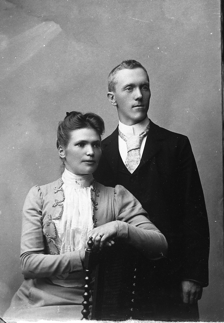 Porträtt av okänt ungt par, en man och en kvinna. Hon sitter vänd på en stol och vilar vänster arm på dess rygg och mannen står intill. Kvinnan heter sannolikt Emelie Gustafsson och är hemmahörande i Stockholm.