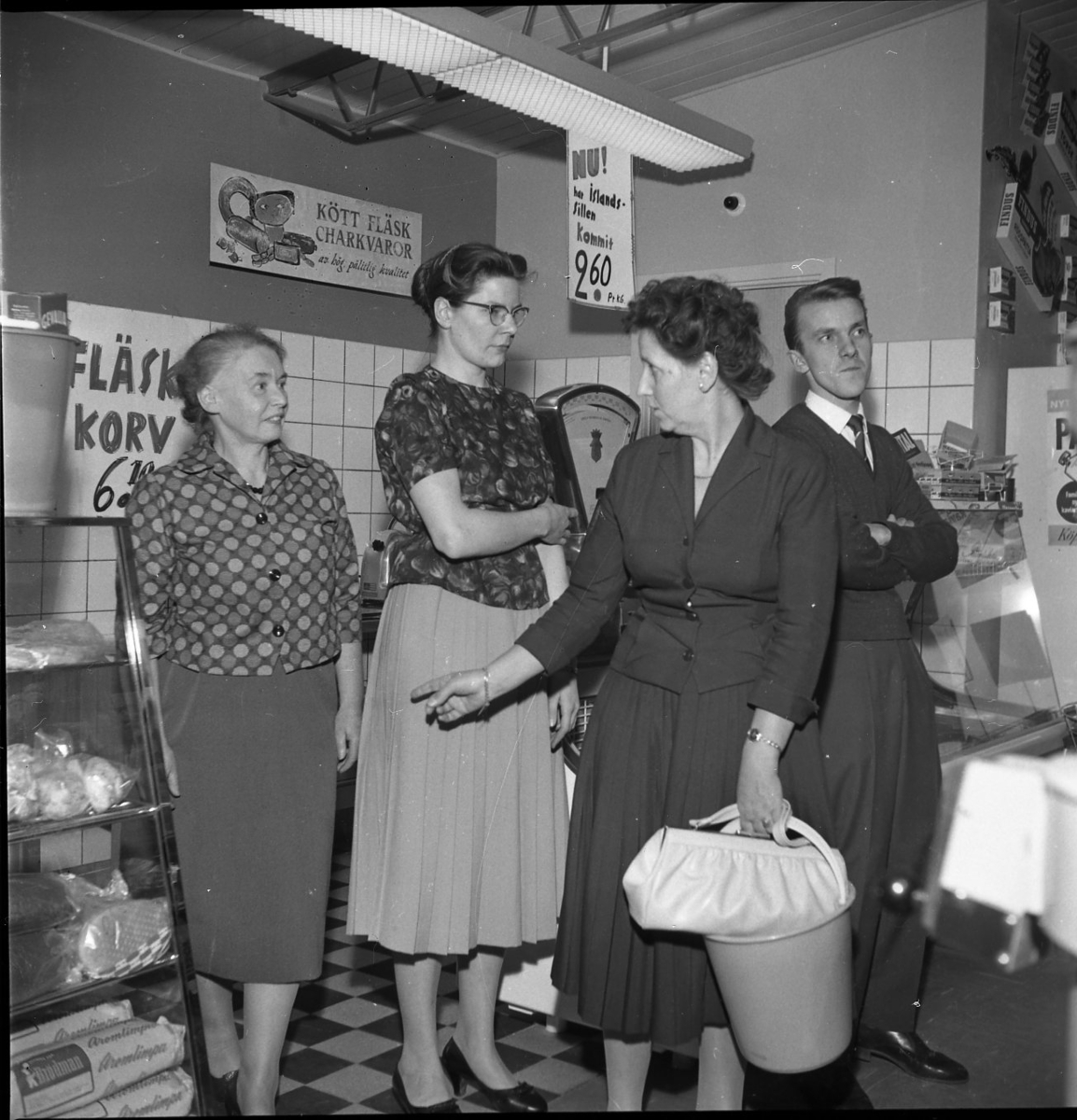 Tre kvinnor och en man står i en charkuteributik. De lyssnar till någon som står utanför bild. En kvinna håller en hink i handen. Damen till vänster kan heta Ryd i efternamn och arbetade i Skär- stads Handelsförening,