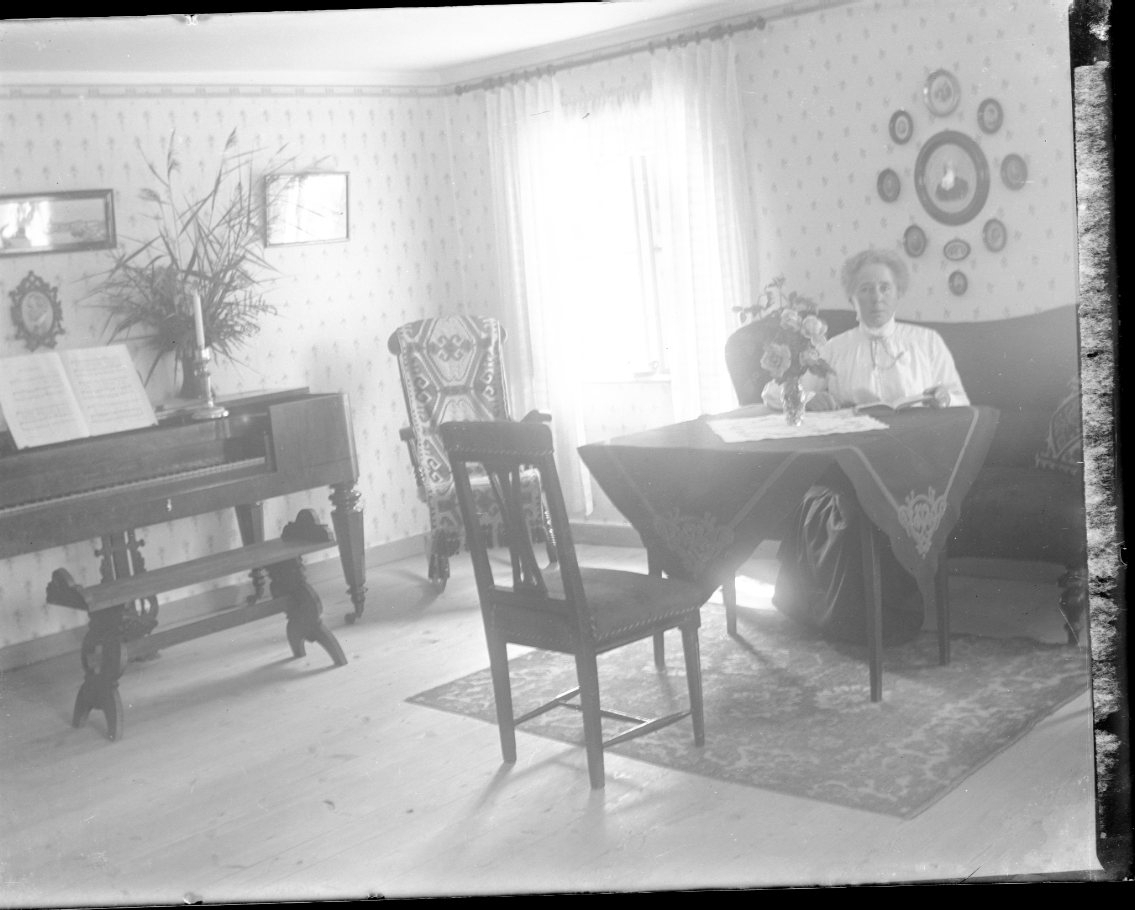 En hemmiljö med ett piano till vänster och en kvinna som sitter vid en soffgrupp till höger.