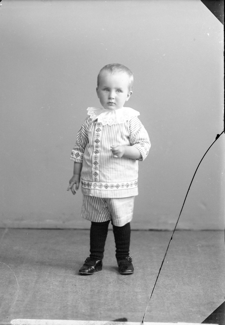 En liten pojke i randiga kläder och vit spretskrage.
