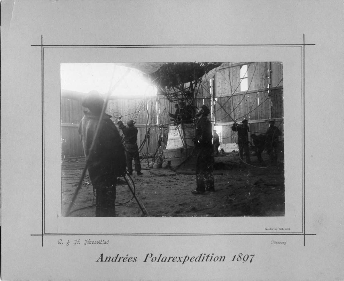 Starten den 11 juli 1897: Andrée till vänster och Strindberg till höger i ballongkorgen. Sannolikt Norselius som tittar uppåt hitom ballongkorgen.