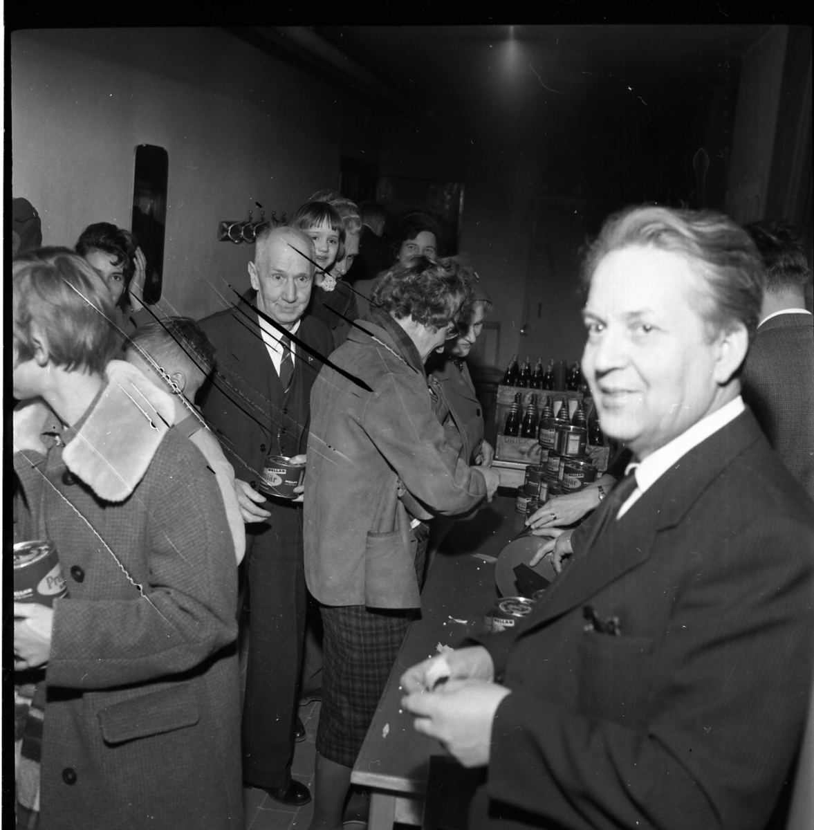 Kvinnor och män vid ett lottstånd. Mannen till höger är sannolikt Tage Grennfelt