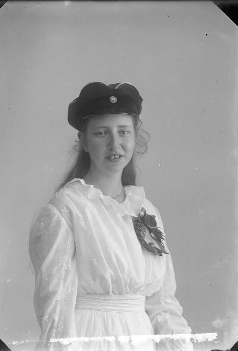 Porträtt av en flicka i tonåren med huvudbonad och någon form av utmärkelse på bröstet, troligen anknytning till utbildning.