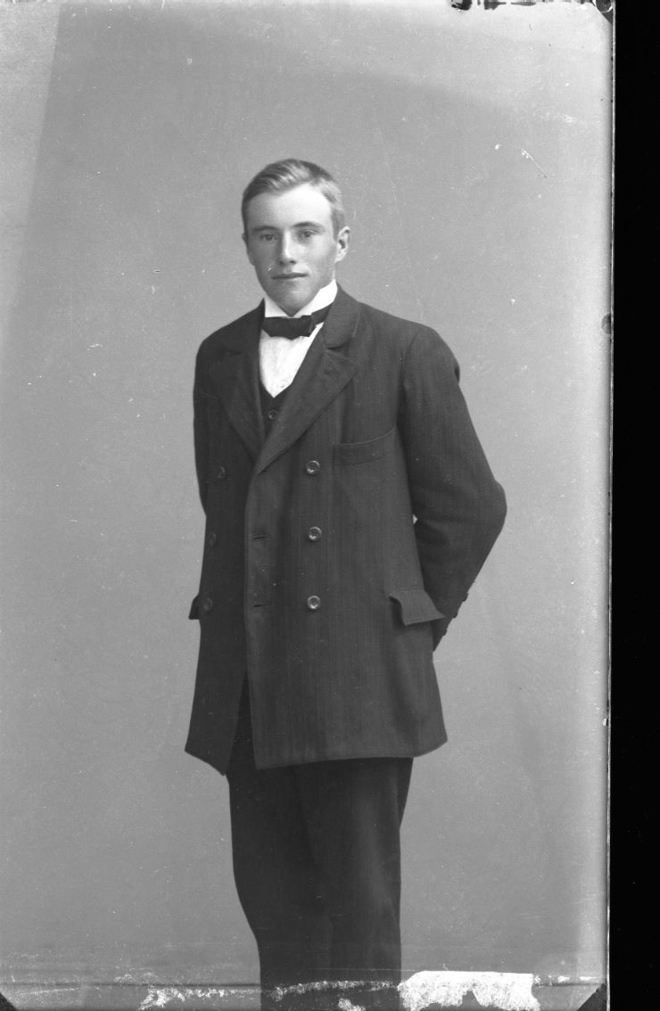 Porträtt av en ung man i finkostym som står med händer bakom ryggen.