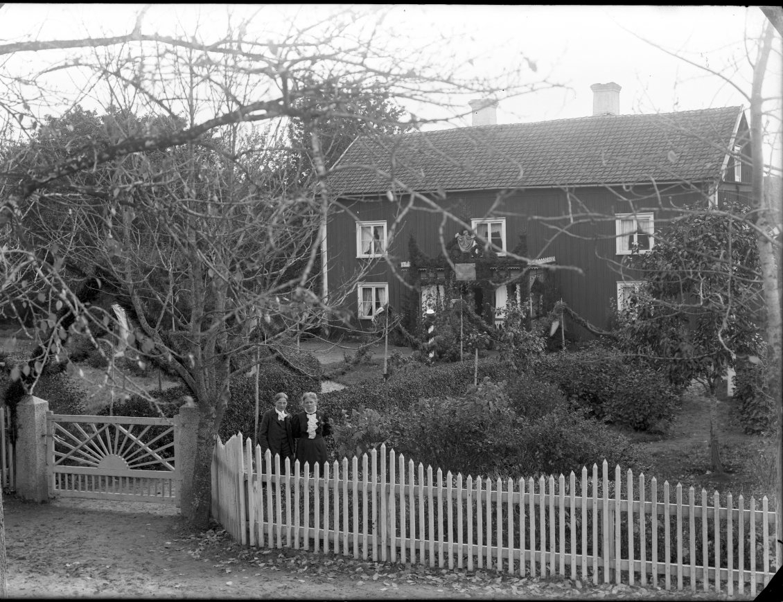 Ett tvåvåningshus med locklistpanel, farstun pyntad med girlanger. Två kvinnor står innanför ett vågigt spjälstaket.