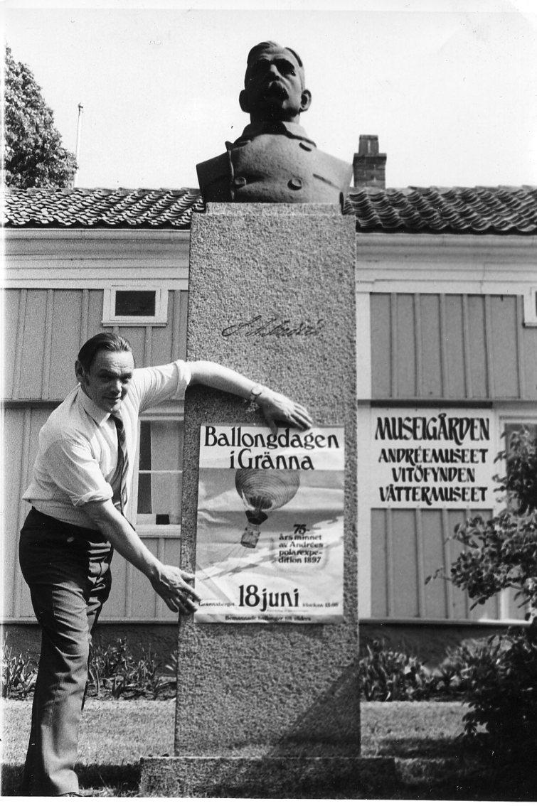 En man håller en affisch för "Ballongdagen i Gränna 18 juni" framför Andréebysten vid Brahegatan. Mannen har slips till skjorta med uppkavlade ärmar.