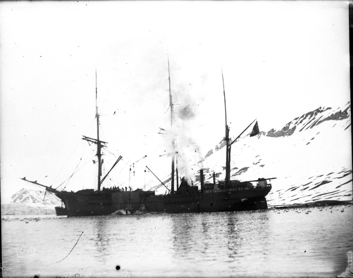 Ett oidentifierat troligen norskt tremastat ångfartyg för ankar vid Spetsbergen. Det ryker möjligen från skorstenen. Snöklädda berg i bakgrunden.