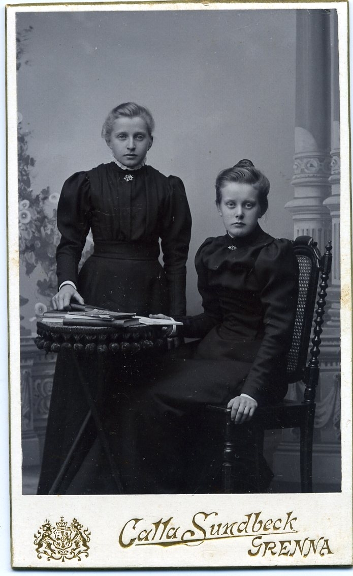Kabinettsfotografi: gruppbild med två okända flickor som står respektive sitter vid ett litet runt bord med böcker.