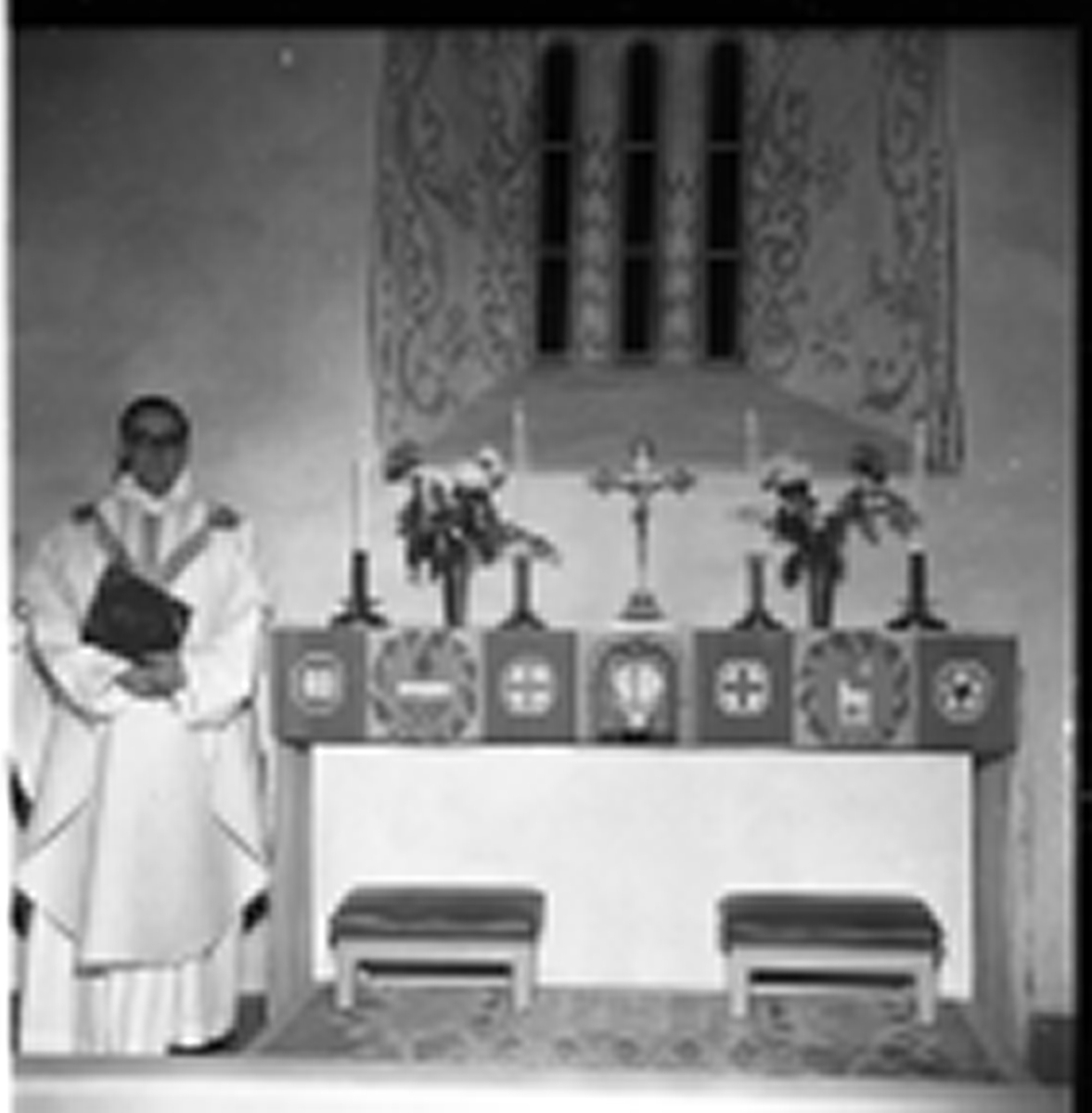 Ett altare med fyra tända ljus och två buketter med dahlior. Ett altarbrun med två bibelreferenser bland annat Johannes 1:36, När Jesus kom gående såg Johannes på honom och sade: »Där är Guds lamm.«. I mitten på altaret står ett krucifix. Bakom altaret finns en fönsternisch med snirkliga målerier. Bredvid altaret står en man iklädd mässhake. Han håller en bok i händerna. Interiörbild från Ölmstads kyrka.
