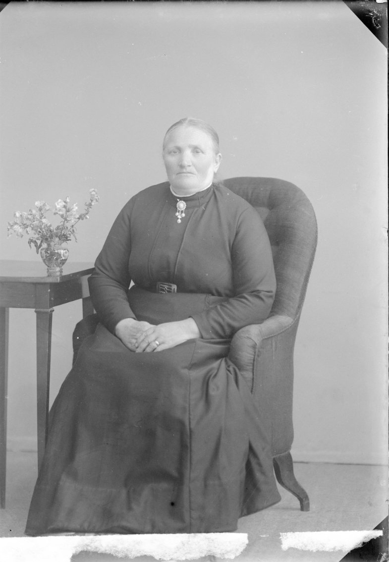 Porträtt av en äldre kvinna. Hon sitter i en fåtölj vid ett bord där det står en vas med blommor.