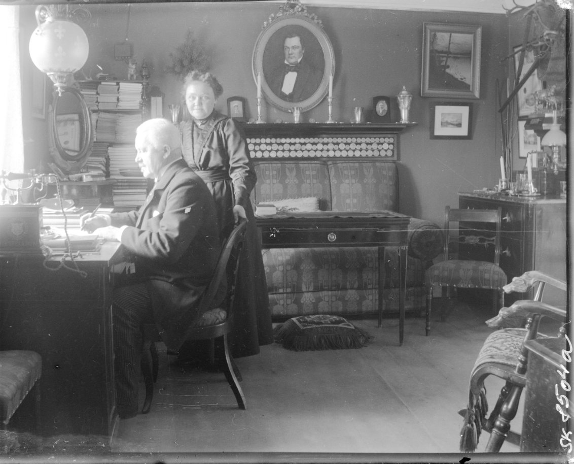En man sitter vid ett skrivbord framför ett fönster. En kvinna står intill med vänster hand på hans stolsrygg.