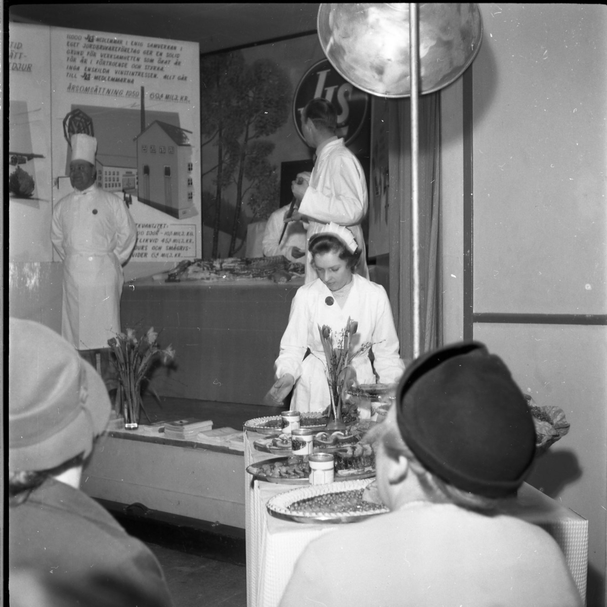 Tre män står vid ett bord på en scen. De bär vita rockar och två av dem bär kockmössor. På bordet ligger ett stort köttstycke. Nedanför scenen står en kvinna vid ett bord. På det bordet står det flera serveringsfat med mat.