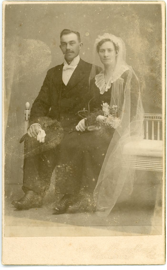 Ett brudpar sitter i en soffa av gustaviansk stil; bruden i mörk klänning.