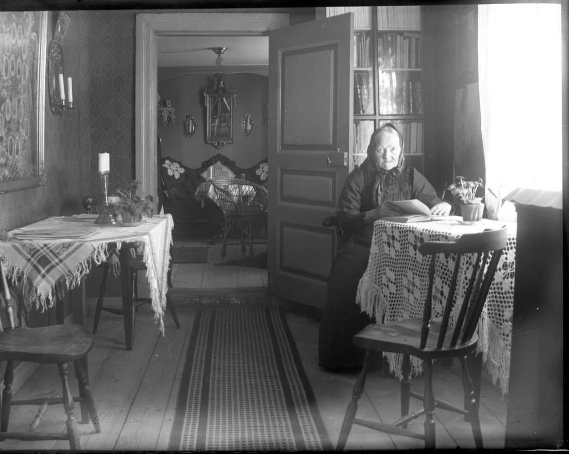 En äldre kvinna med huckle sitter vid ett bord med en uppslagen bok i händerna. Bordet har en virkad duk.