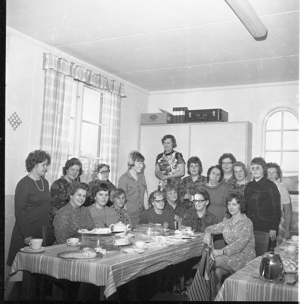 Ett stort antal kvinnor samlade runt ett kaffebord.