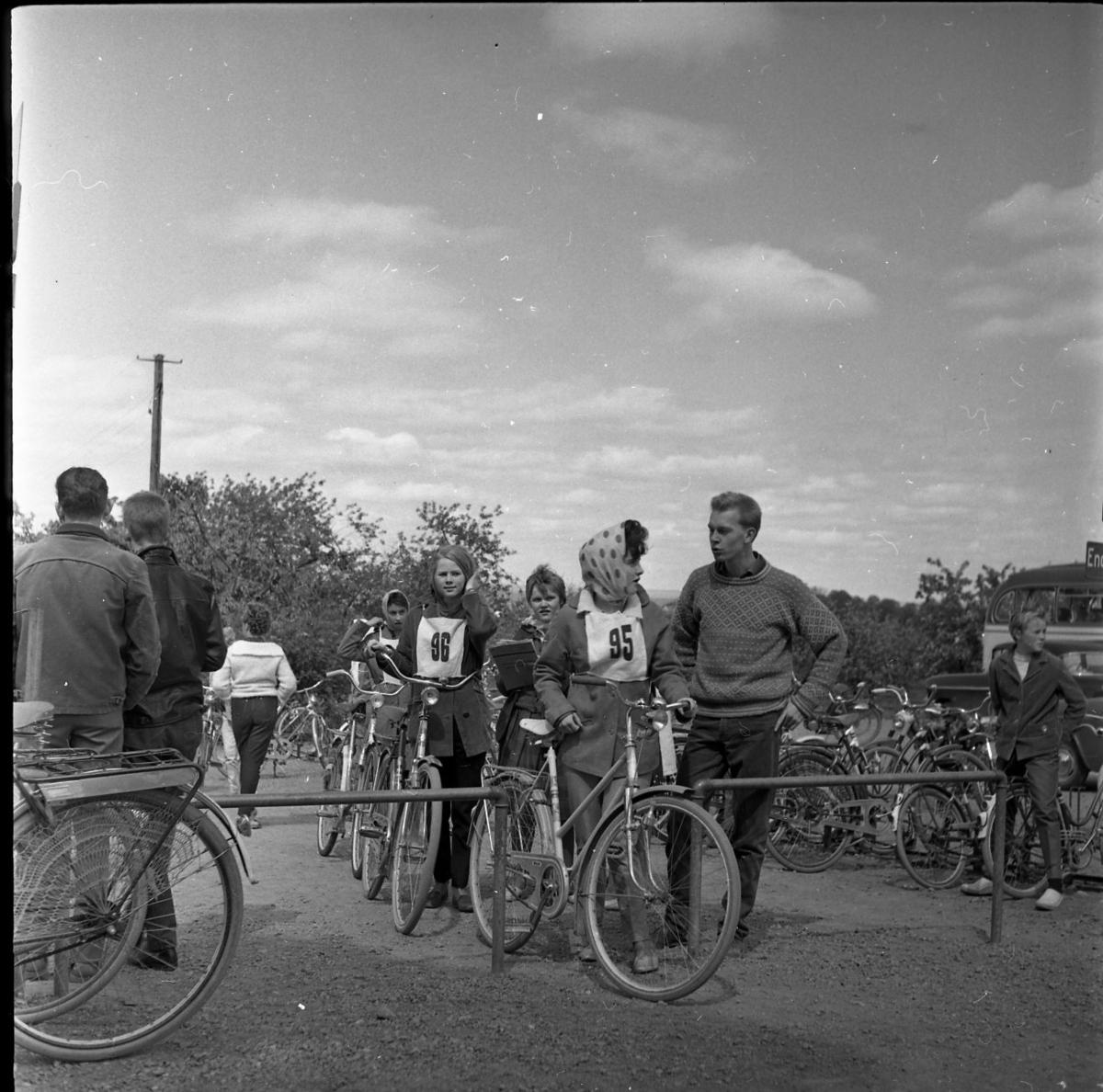 Titel: Människor står bredvid cyklar och pratar. Några bär nummer utanpå sina kläder.